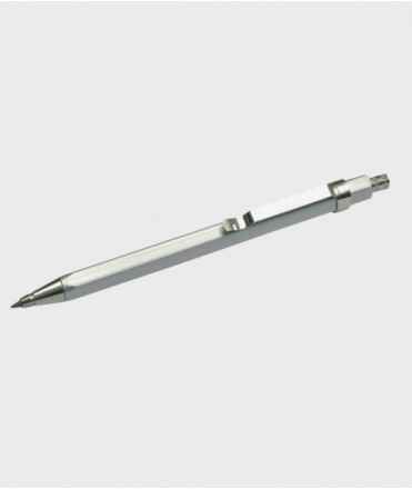 Lápis mecânico de design compacto com corpo hexagonal leve que impede que ele role sobre superfícies. Feito de latão lacado com várias camadas de verniz prateado brilhante. Ele incorpora um clipe de aço inoxidável cromado super elástico para uma fixação firme e durável. Inclui um pequeno afiador incorporado e destacável. Ponta calibrada de 2,0 mm. Mecanismo de clique por pressão.